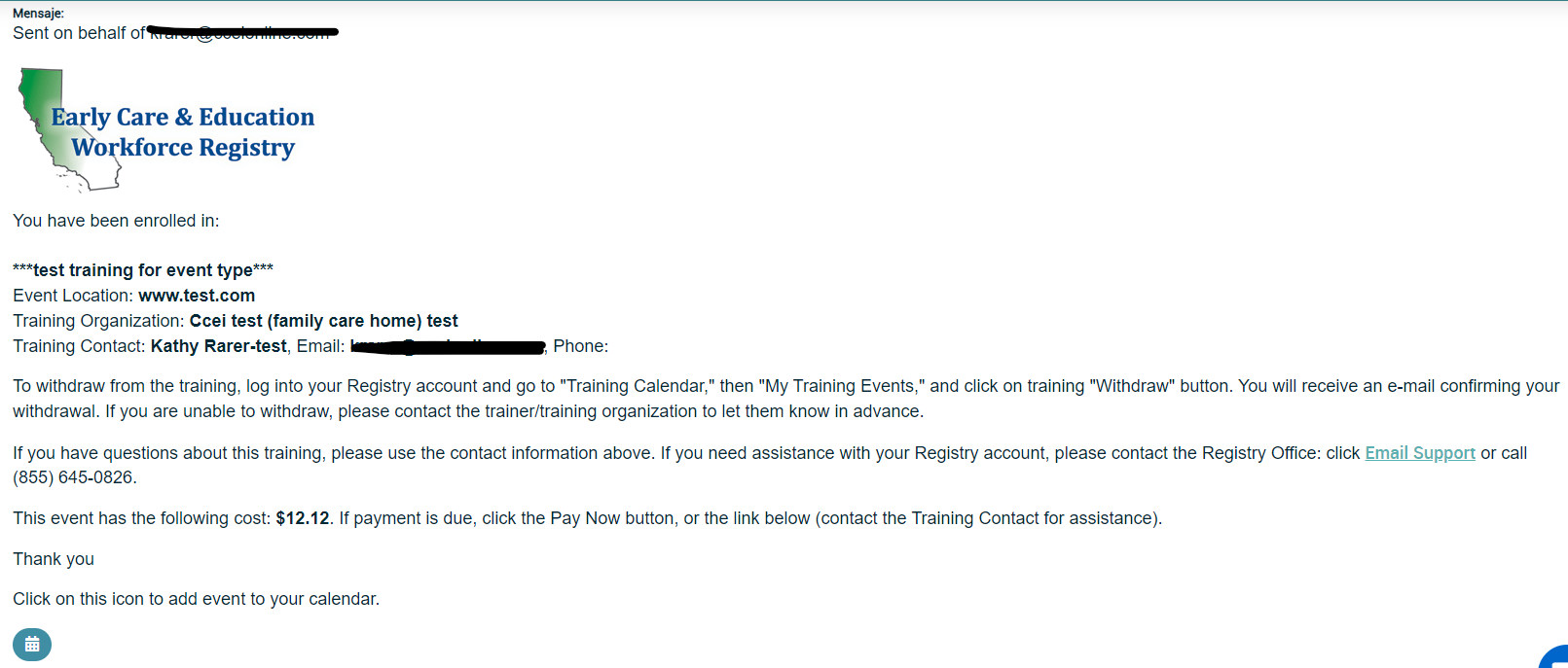 - Busque su correo electrónico para encontrar el correo de confirmación de la capacitación, que debería incluir el enlace para la capacitación. Como referencia, los correos electrónicos de confirmación se envían desde cfmail@caregistry.org.