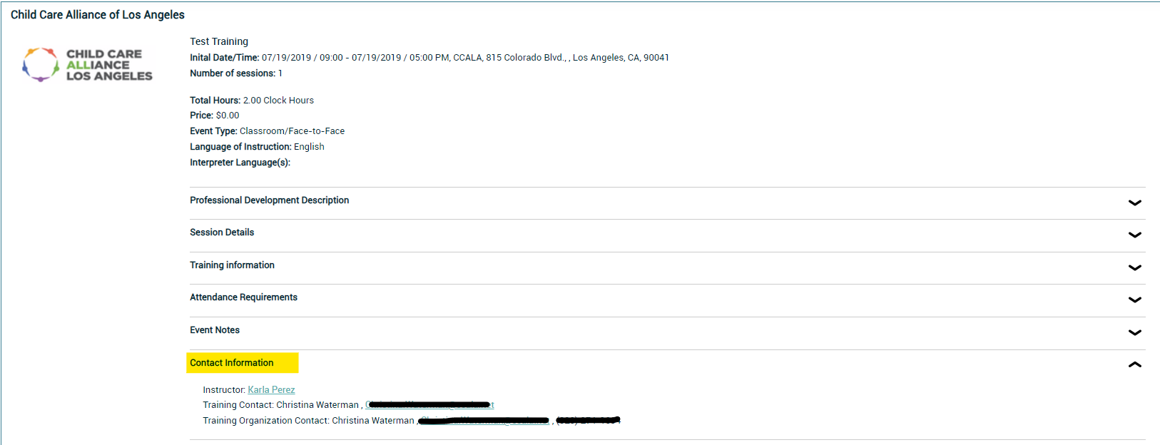 要查看您已注册的培训列表,请登录注册中心并单击 “培训日历” 和 “我的培训活动”。点击“开始日期”查看培训详情。